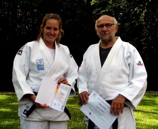 Vorbildlich in ihrem Einsatz für den Judosport und den hiesigen To-Judo-Kan: Die Trainer und Vorstandsmitglieder Mareike Schnoor (li) und Rainer Welbers sind mit dem dritten und fünften Dan-Grad ausgezeichnet worden. Beim To-Judo-Kan Ratzeburg standen einmal nicht die Wettkämpfer im Vordergrund. Diesmal ging es um die Trainer: Mareike Schnoor beeindruckte mit der besten Kata die Prüfer des hiesigen Landesverbandes und bekam den 3. Dan (Schwarzgurt), Cheftrainer Rainer Welbers wurde beim Verbandstag des JVSH für seine Verdienste um den Judosport sogar der 5. Dan überreicht. Die 30-jährige Mareike Schnoor, seit 23 Jahren TJK-Mitglied und ihrem Heimatverein trotz Zweitstartrechts für die Regionalliga-Frauen von Budokan Lübeck immer treu, brillierte in Itzehoe gemeinsam mit ihrem Lübecker Partner Stephan Claasen (Budokan) vor dem Prüfungsgericht. „Eine tolle Vorstellung und herausragende Prüfung“, bescheinigte der Dan-Beauftragte Erwin Schulan aus Kiel, nachdem das Lübeck-Ratzeburger Duo die Gegenwurf-Kata demonstriert hatte. Das halbe Jahr intensiven Kata-Trainings hatte sich für die engagierte Grundschullehrerin (Mathe, Sport) gelohnt. Und die Nachwuchskämpfer des TJK dürfen sich freuen, da ihre nun hochdekorierte Trainerin nach Studium und Referendariat mit frisch gebautem Domizil wieder fest in Ratzeburg angekommen ist. Für ihren Trainer Rainer Welbers (67), der inzwischen mehreren Generationen das Judo-ABC beigebracht hat, gab es beim Verbandstag eine ganz besondere Ehre: Für seine „besonderen Verdienste zur Förderung des Judosports in Schleswig-Holstein“ wurde ihm in der Stadthalle in Neumünster der 5. Dan verliehen. Die JVSH-Vorsitzende Cordula Schwarten betonte seinen unermüdlichen Einsatz für Kinder und Jugendliche, der ihn immer noch fast jedes Wochenende zu den Wettkämpfen des Nachwuchses in die Sporthallen im Land treibt. Und dass das Gründungsmitglied des 1972 erstandenen TJK im wöchentlichen Trainingsbetrieb seinen Mann auf der Matte steht, ist ohnehin seit Jahrzehnten vorbildlich. So war es auch selbstverständlich für den Ratzeburger, am Tag nach seiner Ehrung mit neun Schülern zu den Landesmeisterschaften der U12 zu fahren, die durch Mika Friedrichs, Sabine Schaffer und Leonie Köhler immerhin drei bronzene Plaketten in die Inselstadt brachten. |
